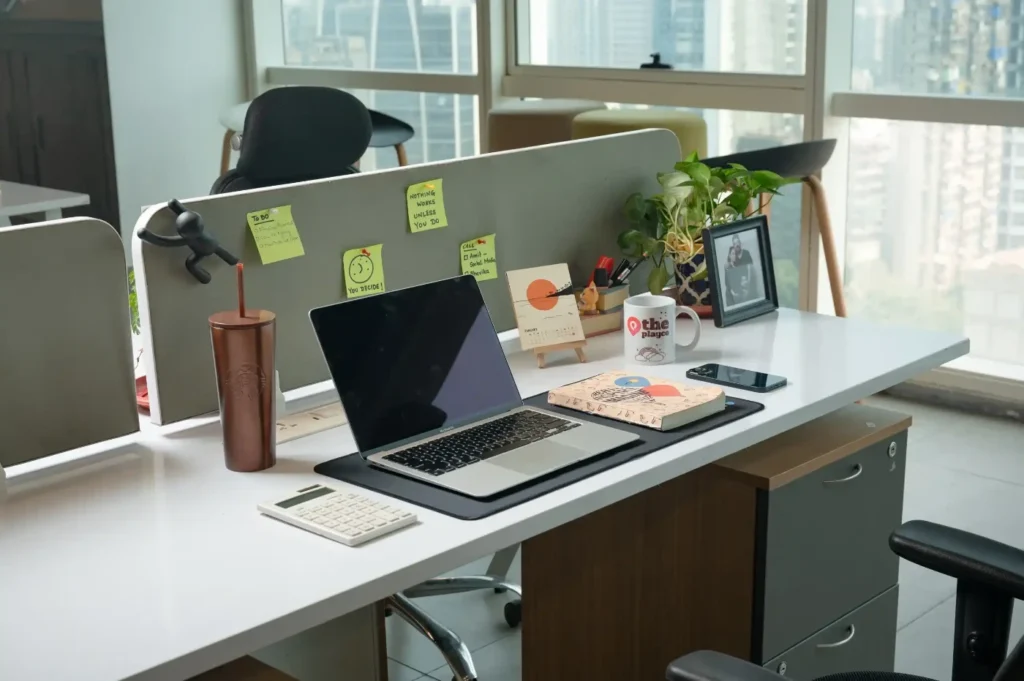 Your personal desk in a vibrant coworking space, perfect for freelancers and remote workers.